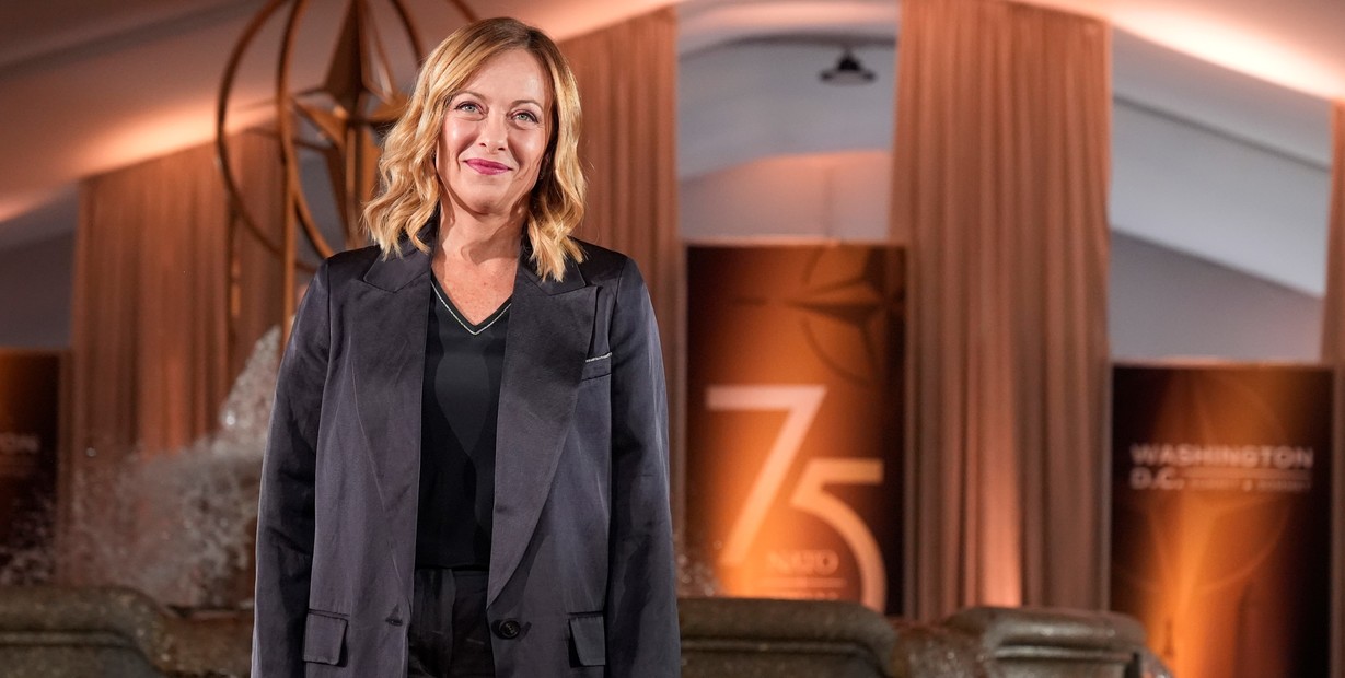 Meloni llega al evento del 75 aniversario de la OTAN, en Washington. Foto: AP